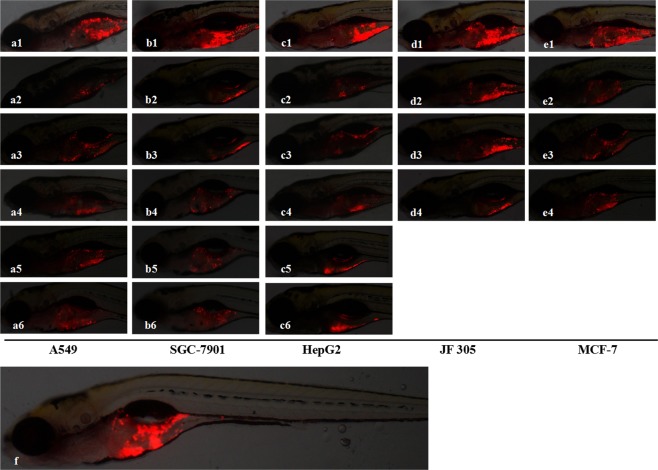 Cancer cell proliferations were suppressed after 48-h drug treatment in the zebrafish xenotransplanted with human A549 non-small-cell lung cancer cells, human SGC-7901 stomach cancer cells, human HepG2 liver cancer cells, human JF 305 pancreatic cancer cells, and human MCF-7 breast cancer cells. a1, b1, c1, d1 and e1 were the control xenotransplanted zebrafish without drug treatment. a2–a6 were treated with Bevacizumab,