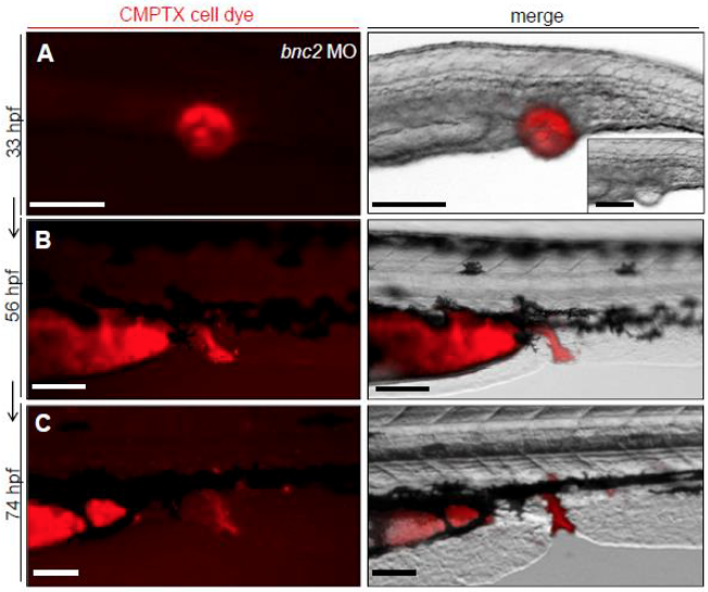 (A-C): Injection of fluorescent cell dye tracker CMPTX into the pronephric outlet obstruction ‘vesicle’ of a bnc2 MO injected zebrafish embryo at 33 hpf and follow-up imaging of the same individual zebrafish demonstrates that cells forming the ‘vesicle’ become part of the distal end of the pronephric ducts and the cloaca later in development (56 and 74 hpf).