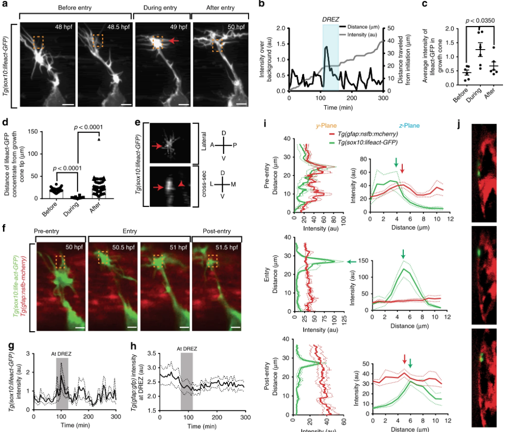 An actin-rich structure forms in pioneer axons during spinal entry. a Confocal z-projection frames from a 24-h time-lapse starting at 48 h post fertilization (hpf) of Tg(sox10:lifeact-GFP) zebrafish showing navigation of the pioneer axon into the spinal cord. Actin accumulates in the central growth cone specifically at the dorsal root entry zone (DREZ). Red arrows denote the actin-rich structure at the tip of the growth cone. Orange dotted box denotes DREZ. Entry occurs at 50 min. bRepresentative intensity profile of Lifeact-GFP at the growth cone (left y-axis, black line) and distance traveled by the growth cone (right y-axis, gray line). Actin concentration specifically occurs during stalling and entry. Shaded blue box denotes the period of axon entry at the DREZ. c Quantification of average intensity of Lifeact-GFP at the growth cone before, during, and after entry to the spinal cord. SEM is shown, n = 6. d Distance of Lifeact-GFP concentrate form the tip of the growth cone before, during, and after entry to the spinal cord. SEM is shown, n = 6. e Deconvolved confocal images of actin-rich structures in Tg(sox10:lifeact-GFP)animals in lateral and cross-sectional views demonstrating the basally projecting actin cluster at the DREZ. Red arrow denotes the same protruding actin concentrate. Red arrowhead denotes basally projecting lifeact-GFP protrusion. Compass shown to right of image denote directional locations on animal. D dorsal, V ventral, A anterior, P posterior, L lateral, M medial. f Confocal z-projection frames from a 24-h time-lapse starting at 48 hpf of Tg(sox10:lifeact-GFP); Tg(gfap:nsfb-mcherry) zebrafish showing navigation of the pioneer axon into the spinal cord. Orange dotted box denotes DREZ. g Intensity profile of Lifeact-GFP at the growth cone. Gray box denotes period of actin concentrate formation. SEM is shown, n = 11 pioneer growth cones. h Intensity profile of Tg(gfap:nsfb-mcherry) at the DREZ. Gray box denotes period of actin concentrate formation in the growth cone. mCherry intensity at the DREZ specifically decreases during actin accumulation in the growth cone. SEM is shown, n = 11 DREZ. i Intensity profiles of Tg(sox10:lifeact-GFP)and Tg(gfap:nsfb-mcherry) across the y- and z-planes of the growth cone in y-orthogonal images before, during, and after entry at the DREZ. The y- and z-planes determined as shown in Fig. 2b. White arrowhead denotes the glia limitans. Black arrowhead denotes the radial glia cell soma. SEM is shown, n = 11 DREZ. j The y-orthogonal images of used to create intensity profiles in (i). Scale bars denote 10 µm. Tukey’s honestly significant difference (HSD) (d)