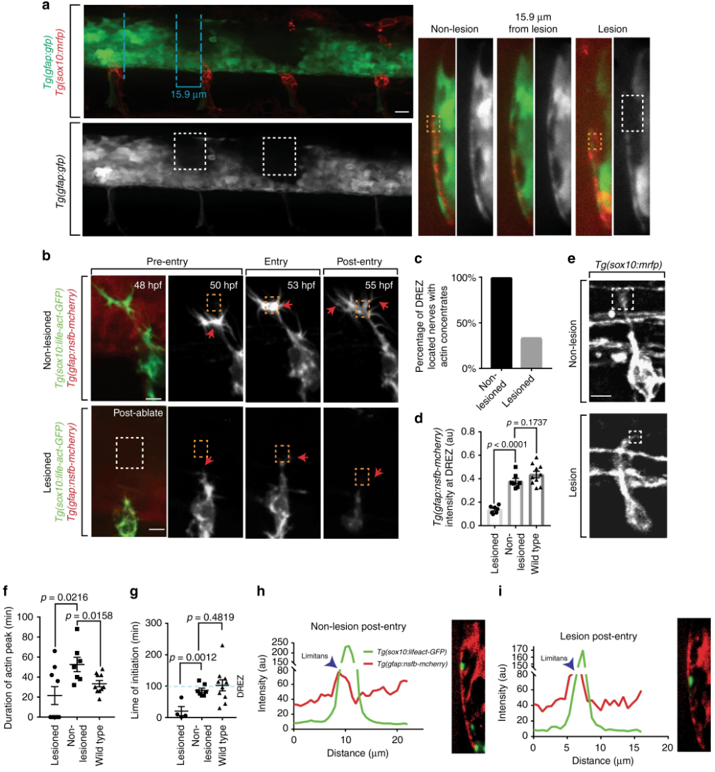 Actin-rich structures form to cross a radial glial boundary. a Confocal z-projection image of a Tg(sox10:mrfp); Tg(gfap:gfp) zebrafish after focal lesions at the dorsal root entry zone (DREZ), displaying the mechanism of focal ablations with adjacent, control non-lesioned nerves. Dashed blue lines indicate the plane shown in the y-orthogonal images. Dashed white boxes denote area of lesion. b Confocal z-projection frames from a 24-h time-lapse starting at 48 h post fertilization (hpf) of Lifeact-GFP, Tg(gfap:nsfb-mcherry) zebrafish showing navigation of the pioneer axon into the spinal cord in animals with a lesioned DREZ and a non-lesioned DREZ. Axons with lesioned DREZ fail to form actin concentrates. Red arrows denote the tip of the growth cone. White dotted box denotes the DREZ lesion. Orange dotted box denotes DREZ. c Quantification of DREZ-located axons that form actin-rich structures with a lesioned and non-lesioned DREZ. SEM is shown, n = 9 dorsal root ganglia (DRG) with a lesioned DREZ, n = 8 DRG with a non-lesioned DREZ. dQuantification of relative intensity of Tg(gfap:nsfb-mcherry) at the DREZ in wildtype (n = 10 DRG), lesioned (n = 9 DRG), and non-lesioned (n = 8 DRG) animals. SEM is shown. e Confocal images of a Tg(sox10:mrfp) growth cone during spinal cord entry with a lesioned and non-lesioned DREZ. f Quantification of duration of actin concentrates in wildtype, lesioned, and non-lesioned animals. SEM is shown, n = 10 wildtype animals, n = 8 non-lesioned animals, n = 9 lesioned animals. gQuantification of time of initiation of actin concentrates in wildtype, lesioned, and non-lesioned animals. Dotted blue line denotes when axons approach the DREZ. SEM is shown, n = 10 wildtype animals, n = 8 non-lesioned animals, n = 9 lesioned animals. h Representative intensity profile of Tg(sox10:lifeact-GFP) and Tg(gfap:nsfb-mcherry) through the z-plane of the growth cone and corresponding y-orthogonal image in a non-lesioned DREZ after entry. Measurements collected as described in Fig. 2b. i Representative intensity profile of Tg(sox10:lifeact-GFP) and Tg(gfap:nsfb-mcherry) through the z-plane of the growth cone and corresponding y-orthogonal image in a lesioned DREZ after axon entry. Measurements collected as described in Fig. 2b. Scale bars denote 10 µm. Tukey’s honestly significant difference (HSD) (d, f, g)