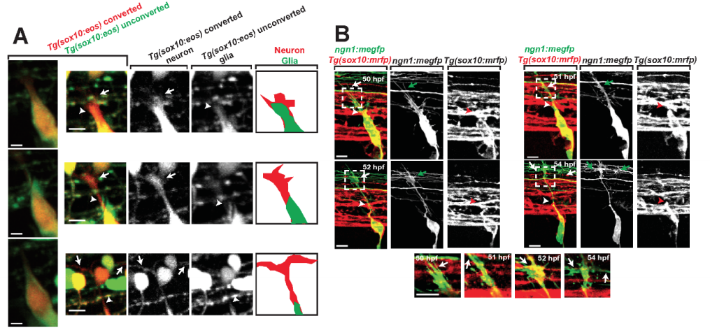 Supplementary Figure 1. Glial projections do not extend with the pioneer axon to the DREZ, related to Figure 1. (A). Confocal z-projection frames from a 24-hr timelapse starting at 48 hpf of a Tg(sox10:eos) zebrafish with a photoconverted neuron. White arrow denotes pioneer axon growth cone. White arrowhead denotes trail-ing glial process. Images on the right show the growth cone contacting the DREZ with traced representations of the neuron (red) and glia (green) (B). Confocal z-projection frames of a 24-hr time-lapse starting at 48 hpf of a Tg(sox10:mrfp) with mosaic expression of ngn1:megfp. The pioneer axon leads the associated glia throughout its navigation before, during, and after DREZ entry. White and green arrows denotes growth cone, and white and red arrowheads denotes the trailing glia. Insets shown below represent the pioneer growth cone in single-planes. Scale bars denote 10 µm.