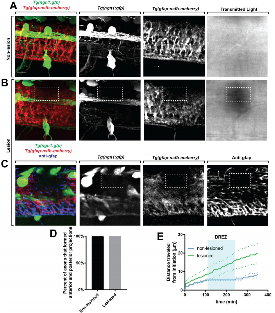 Focal lesions cause ablation of glia limitans, related to Figure 4. (A-B). Confocal images of a Tg(ngn1:gfp); Tg(gfap:nsfb-mcherry) zebrafish with (B) and without (A) a DREZ lesion. Images taken of the DREZ using transmitted light are also included. Dashed white box denotes lesion. (C). Confocal images of a Tg(ngn1:gfp); Tg(gfap:nsfb-mcherry) zebrafish with a lesioned DREZ stained for GFAP. Dashed white box denotes lesion. (D). Quantification of the percent of axons with a lesioned and nonlesioned DREZ that form anterior and posterior projections in the spinal cord. n=5 lesioned, n=5 non-lesioned. (E). Graph of distance traveled by axons with a lesioned (green) and non-lesioned (blue) DREZ. Shaded blue box denotes the area of the DREZ. Dotted lines denote SEM. Note: Lesioned axons travel further distances because of the absence of stalling at the DREZ. Scale bars denote 10 µm.