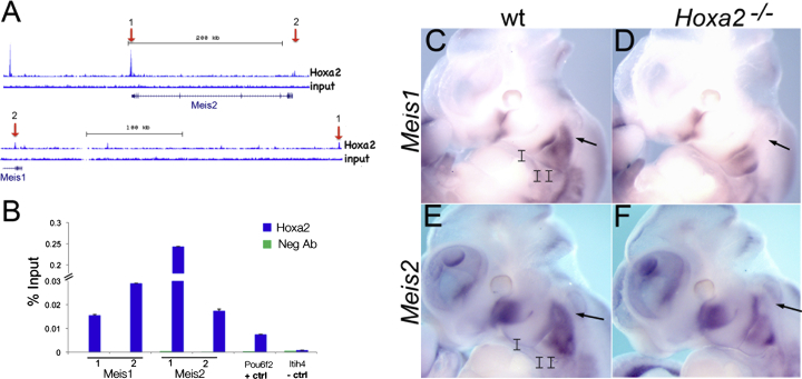 (A) ChIP-seq-binding profile of Hoxa2 at Meis1 and Meis2 genes in E11.5 IIBA. Input tracks represent control genomic DNA. Arrows highlight the binding regions tested by ChIP qPCR in (B).