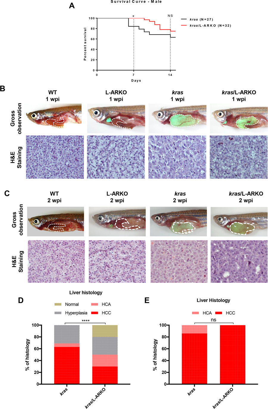 Effects of liver-specific ar knockout on male kras zebrafish. (A) Kaplan-Meier survival curves of male kras and kras/L-ARKO zebrafish during 14-day Dox treatment. (B,C) Representative images of the gross observations (upper) and liver histology images (lower) from WT, L-ARKO, kras and kras/L-ARKO zebrafish after Dox induction for one week (B) or two week (C). Livers are outlined by a dashed line. (D,E) Quantitative analyses of histological phenotypes of liver sections from the 1-wpi (D) and 2-wpi (E) samples. HCA, hepatocellular adenoma; HCC, hepatocellular carcinoma. Statistical significance between the kras and kras/L-ARKO groups for the incidence of different tumor types: *p < 0.05; ****p < 0.0001; ns, no significant difference.