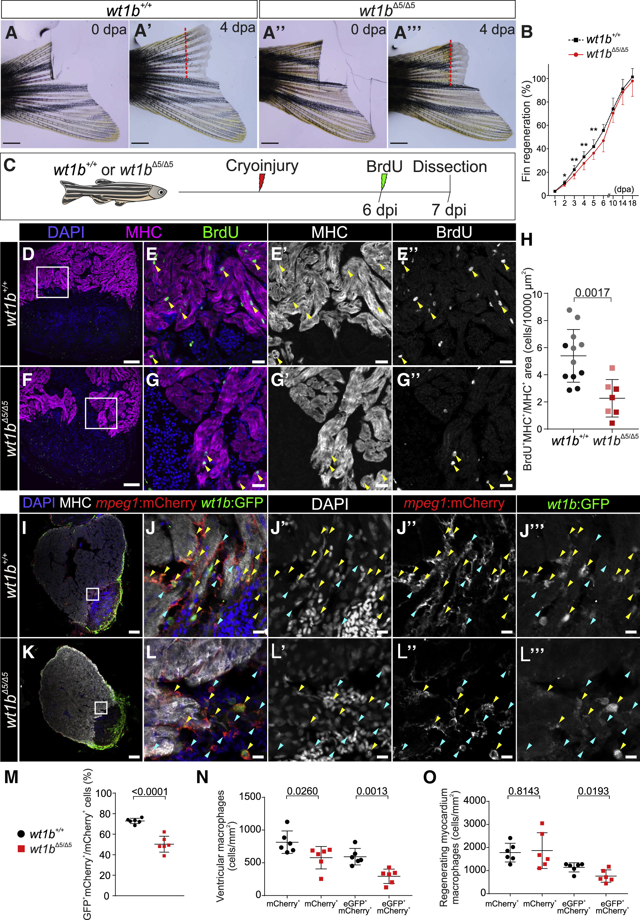 (I–O) Localization of wt1b:eGFP;mpeg1:mCherry cells in cryoinjured wt1b+/+ and mutant wt1bΔ5/Δ5 hearts at 7 dpi.