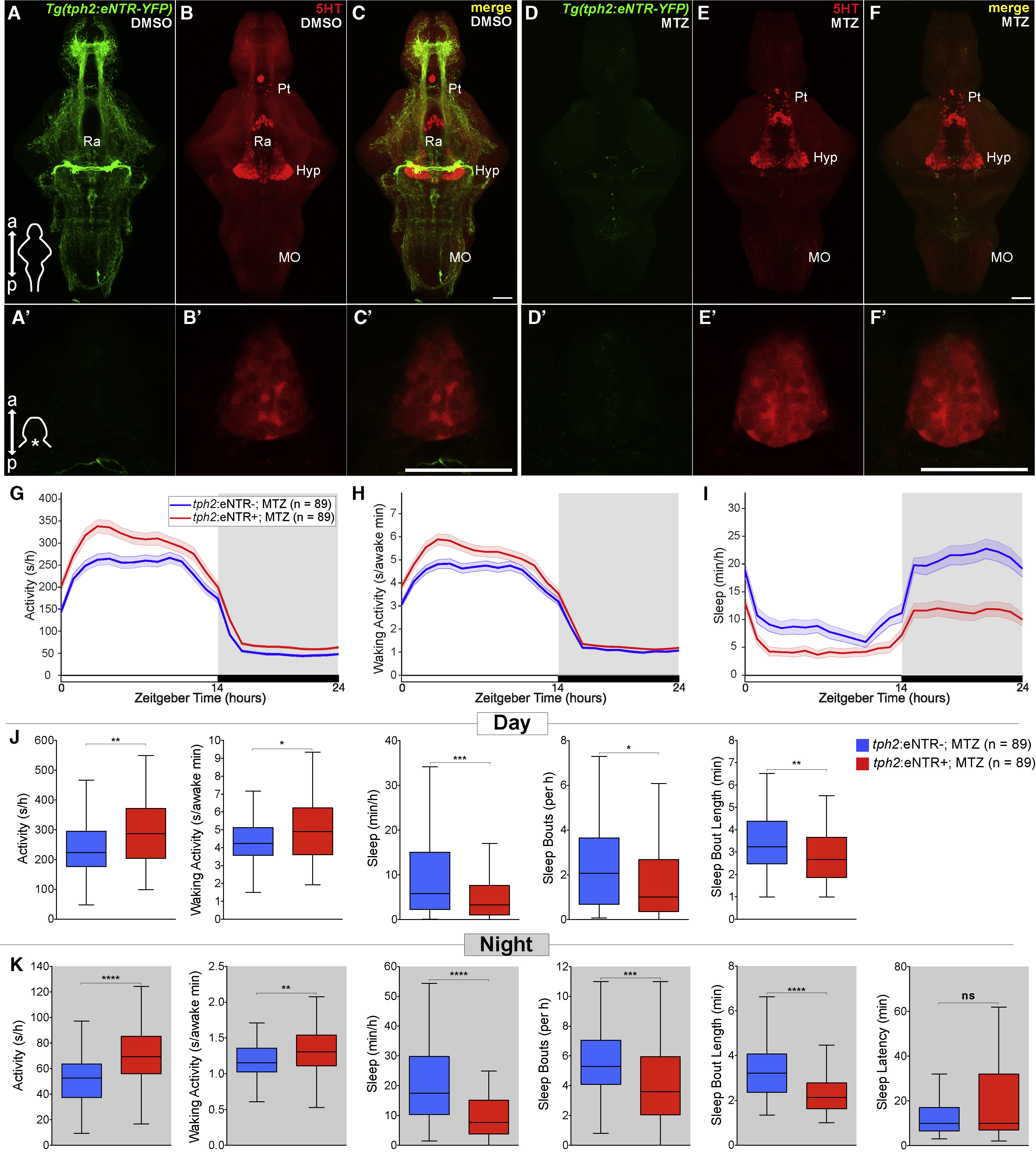 (G–I) Activity (G), waking activity (H), and sleep (I) for 5 dpf Tg(tph2:eNTR-YFP) (red) and non-transgenic sibling control (blue) zebrafish treated with MTZ. Line and shading represent mean ± SEM.