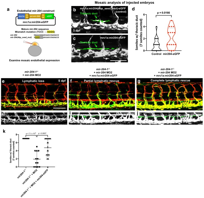 (a,b) Representative confocal images of mid-trunk of 3 dpf of (a) Tg(mrc1a:eGFP) or (b) Tg(mrc1a:mir204-eGFP). The thoracic duct is pseudocolored in green, with other vessels in gray. (c) Quantification of thoracic duct formation in animals as in panels a and b. The number of somitic segments with an intact thoracic duct was counted, with the same seven mid-trunk somites measured in each animal. (d) Quantification of the area between the dorsal aorta (DA) and posterior cardinal vein (PCV) in animals as in panels a and b, as an indicator of developmental timing. (e) Quantitation of mir-204 level measured by TaqMan qPCR from whole embryo at three dpf. All graphs are analyzed by t-test and the mean ± SD is shown.