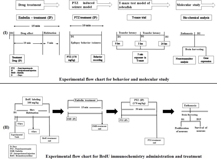 Experimental setup and design procedure. The flowchart represents the scheme for drug treatment, PTZ administration, and behavior recording for epilepsy and T-maze used in the study.