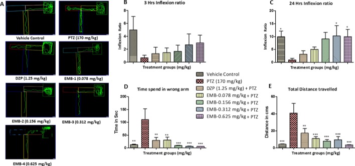 T-maze tracking pattern and behavior analysis of embelin treatment against pentylenetetrazole (PTZ) induced seizures and cognitive dysfunction.