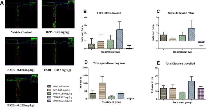 T-maze tracking pattern and behavior analysis of embelin treatment in adult healthy zebrafish: (A) represents the T-maze tracking pattern of locomotor behavior for the control and DZP treated and embelin (EMB) treated groups. (B, C) represent the graph plot of the inflection ratio at 3 and 24 h. T-maze trail in adult healthy zebrafish. (D, E) represent the time spent in the wrong arm and total distance traveled by each fish to reach the deeper chamber of the T-maze in adult healthy zebrafish. Data are represented as mean ± SEM, n = 8, and statistically analyzed by one-way ANOVA followed by Dunnett’s test.