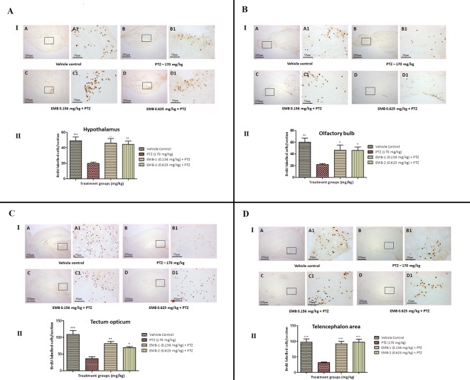 BrdU immunohistochemistry analysis of the effects of embelin in improving neurogenesis and migration of cells generated during adulthood from the molecular layer to the granular layer within the molecular zone of the hypothalamus, the internal cellular layer of the olfactory bulb of the periventricular gray zone of TeO, and the medial zone of the dorsal telencephalic area against pentylenetetrazole-induced epilepsy the zebrafish brain. (I) BrdU-positive staining revealed labeling and number of migration of cells at day 15 of maturation and differentiation stage at the molecular zone of each section of zebrafish brain with BrdU labeling. Photomicrographs of the sagittal section of treatment groups were