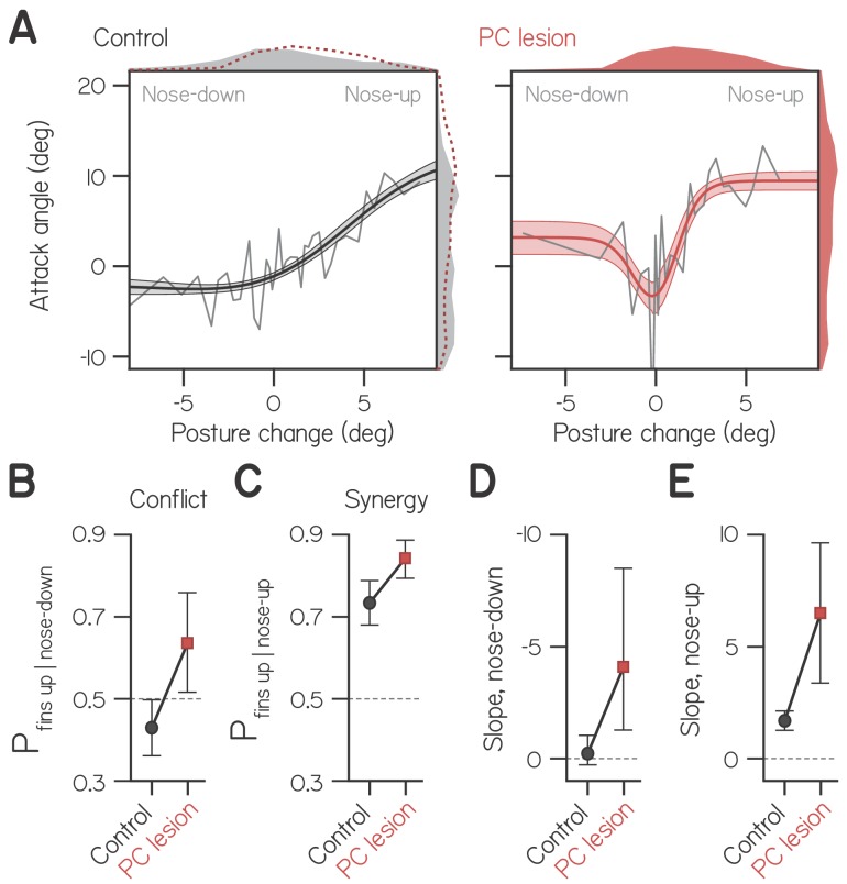 Figure 4. Cerebellar lesion impairs fin-body coordination.