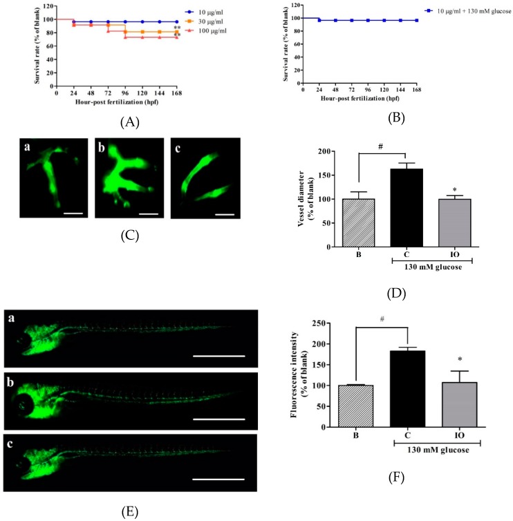 Effects of Ishige okamurae (IO) extract on zebrafish embryo. (A) Effects of IO extract on the survival rate of transgenic zebrafish (flk:EGFP) embryos. The embryos were treated with 10, 30, and 100 µg/mL of IO extract for 24, 48, 72, 96, 120, 144, and 168 h post fertilization (hpf). The treatment effects were normalized to blank (0 µg/mL IO extract). (B) The survival rate of transgenic zebrafish (flk:EGFP) embryos treated with 10 µg/mL IO extract and 130 mM glucose together. (C) Fluorescence microscopic images of the retinal vessels of transgenic zebrafish (flk:EGFP) embryos treated with IO extract. (D) The diameter of the hyaloid retinal vessel treated with IO extract. (E) Images of the whole body vessel formation in transgenic zebrafish (flk:EGFP) embryos treated with IO extract as obtained by fluorescence microscopy. (F) Quantified fluorescence intensity of the whole body treated with IO extract (a: 0 mM glucose + 0 µg/mL IO, b: 130 mM glucose + 0 µg/mL IO, and c: 130 mM glucose + 10 µg/mL IO). The effects of 130 mM glucose on vessel formation were compared with B (blank (0 mM glucose + 0 µg/mL IO extract)). The effects of Ishophloroglucin A (IPA) on high glucose-induced vessel formation were normalized to C (control (130 mM glucose + 0 µg/mL IO extract)). Scale bar (C) 20 µm, (E) 1000 µm. * p ˂ 0.05, #p ˂ 0.05.