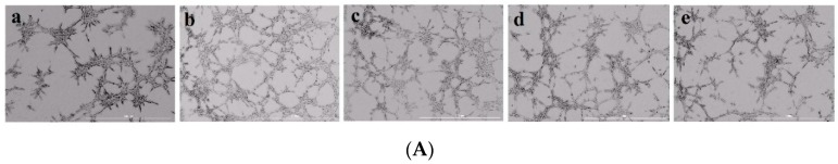(A) IPA suppresses high glucose-induced capillary formation in Matrigel®. The cells were seeded on Matrigel® with different concentrations of IPA (0.15, 0.5, and 1.5 µM), along with 30 mM glucose including B (blank (0 mM glucose + 0 µM IPA)) and C (control (30 mM glucose + 0 µM IPA)). After 6 h incubation, the cells were photographed and the angiogenic score was determined. (B) Quantification of capillary formation. The effects of 30 mM glucose on capillary formation were compared to B (blank (0 mM glucose + 0 µM IPA)). The effects of IPA on high glucose-induced capillary formation were normalized to C (control (30 mM glucose + 0 µM IPA)). Scale bar (A) 1000 µm. * p ˂ 0.05, ** p ˂ 0.01, *** p ˂ 0.001, ###p ˂ 0.001.