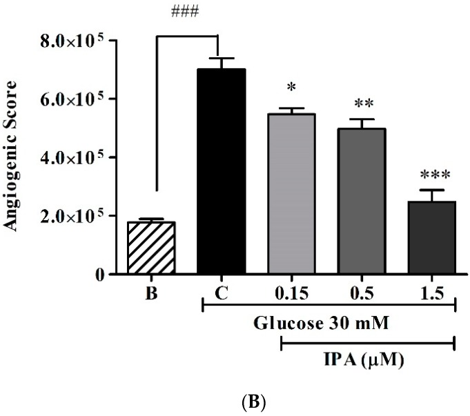 (A) IPA suppresses high glucose-induced capillary formation in Matrigel®. The cells were seeded on Matrigel® with different concentrations of IPA (0.15, 0.5, and 1.5 µM), along with 30 mM glucose including B (blank (0 mM glucose + 0 µM IPA)) and C (control (30 mM glucose + 0 µM IPA)). After 6 h incubation, the cells were photographed and the angiogenic score was determined. (B) Quantification of capillary formation. The effects of 30 mM glucose on capillary formation were compared to B (blank (0 mM glucose + 0 µM IPA)). The effects of IPA on high glucose-induced capillary formation were normalized to C (control (30 mM glucose + 0 µM IPA)). Scale bar (A) 1000 µm. * p ˂ 0.05, ** p ˂ 0.01, *** p ˂ 0.001, ###p ˂ 0.001.