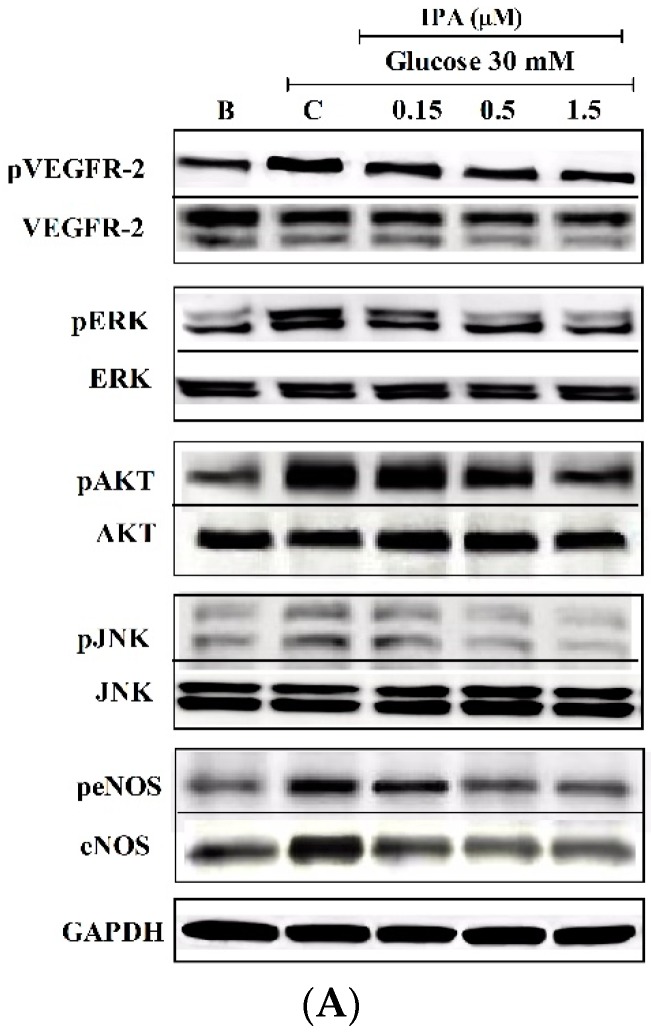 (A) IPA inhibits vascular endothelial growth factor receptor 2 (VEGFR-2) and its downstream signaling molecules. IPA attenuating high glucose-induced phosphorylation of VEGFR-2 and downstream signaling molecules extracellular signal-regulated kinase (ERK), protein kinase B (AKT), c-Jun N-terminal kinase (JNK), and endothelial nitric oxide synthase (eNOS) were detected using western blotting. (B) Quantitative evaluation of the protein expression. The effects of 30 mM glucose on the expression of each protein were compared to B (blank (0 mM glucose + 0 µM IPA)). The effects of IPA on high glucose-induced protein expression were normalized to C (control (30 mM glucose + 0 µM IPA)). ns; not significant, * p ˂ 0.05, ** p ˂ 0.01, *** p ˂ 0.001, #p ˂ 0.05, ##p ˂ 0.01, ###p ˂ 0.001.