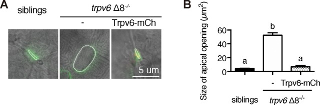 (A–B) Progenies of a trpv6Δ8+/-;Tg(igfbp5a:GFP) intercross were injected with or without the BAC(igfbp5a:Trpv6-mCherry) DNA. At 3 dpf, larvae were photographed, followed by individual genotyping. Representative images are shown in (A). The apical opening of NaR cells were quantified and shown in (B). Data are Mean ± SEM, n = 8–42. Different letters indicate significant difference at p<0.05, one-way ANOVA followed by Tukey’s multiple comparison test.