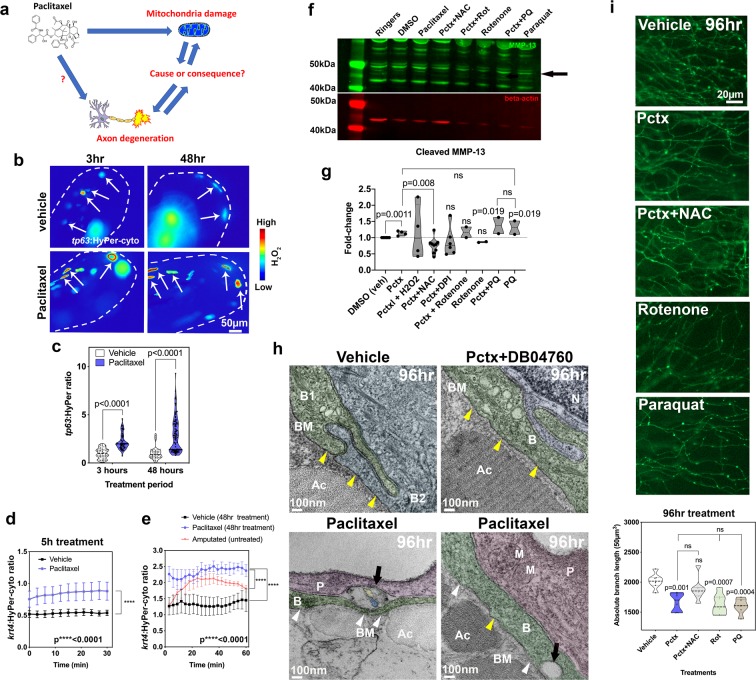 Mitochondrial ROS contribute to MMP-13 expression and axon degeneration. (a) Is mitochondrial damage involved in paclitaxel-induced axon degeneration? (b) Ratiometric images showing HyPer oxidation (arrows) in the caudal fin of larval zebrafish (dashed lines) after 3 and 48 hr of treatment (2 and 4dpf, respectively) with either 0.09%DMSO vehicle or 23 µM paclitaxel. Keratinocytes are mosaically labeled following transient injection of tp63:HyPer into 1-cell stage embryos. High oxidation is represented in red and low oxidation in blue (n = 2–3 biological replicates with 5–7 fish per group). (c) Quantification reveals increased oxidation after short and long-term treatment with paclitaxel, n = 10–15 animals. (d,e) 30–60 min quantifications of HyPer oxidation in epidermal cells expressing krt4:HyPer following treatment for 5 (d) and 48 hr (e), n = 3–6 animals in each treatment group, SEM. Paclitaxel treatment significantly elevates H2O2 levels. Comparison with H2O2 induced by fin amputation shows continuous versus transient H2O2 elevation. (f,g) Western blot (black arrow indicates cleaved MMP-13, 48 kDa) (f) and quantitative analysis (g) shows increased MMP-13 expression following treatment with paclitaxel and the mitochondrial ROS inducer paraquat but not rotenone. Antioxidants (NAC and DPI) reduce MMP-13 levels induced by paclitaxel treatment (replicate number is indicated by dots in the graph, each replicate contained pools of 10 fish). (h) TEM of (6dpf) zebrafish keratinocytes following 96 hr treatment with either 0.09% DMSO vehicle, 23 µM paclitaxel + DB04760 (MMP-13 inhibitor) or paclitaxel alone shows an intact basement membrane (yellow arrowheads) in vehicle and paclitaxel + DB04760 treated fish, whereas the basement membrane is discontinuous (white arrowheads) and large gaps (black arrows) appear where unmyelinated sensory axons normally reside (n = 3 animals per treatment group). (i) Epidermal unmyelinated sensory axons in the distal tail fin following 96 hr treatment with vehicle, paclitaxel, paclitaxel + NAC, rotenone, or paraquat. Quantification of treatments shows paclitaxel, rotenone, and paraquat induce axon degeneration whereas NAC co-administration prevents degeneration, n = 2 biological replicates, 5–7 animals per treatment group, SEM. Abbreviations: NAC = N-acetylcysteine, Pctx = paclitaxel, Rot = rotenone, PQ = paraquat, B = basal keratinocyte, BM = basement membrane, Ac = actinotrichia, N = nucleus, P = periderm, M = mitochondrion, dpf = days post fertilization.