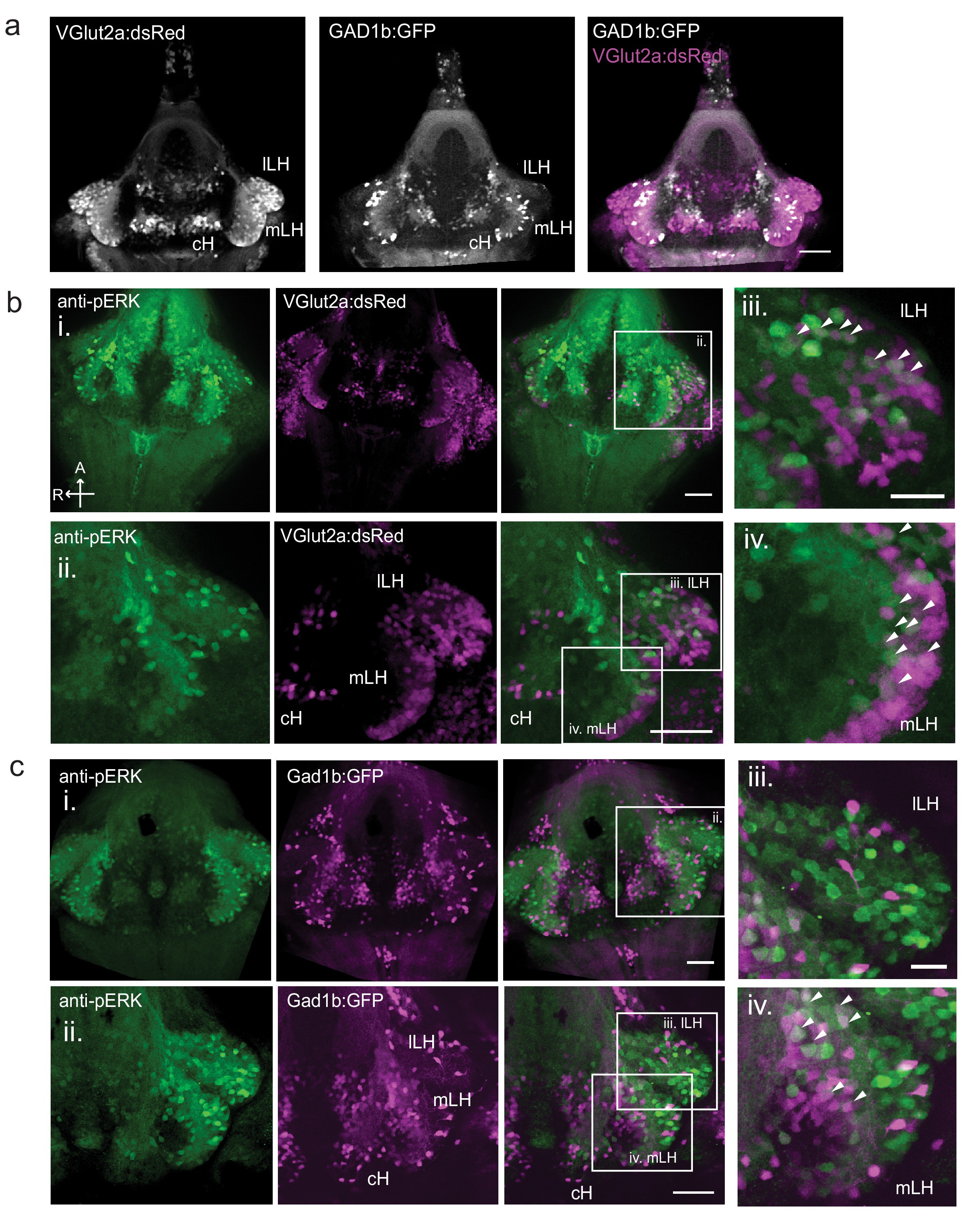 ( a) Glutamatergic and GABAergic neuron distribution in the hypothalamus. Tg(VGlut2a:dsRed) and Tg(GAD1b:GFP) transgenic fish were dissected, imaged and registered onto a common reference hypothalamus. All fish in this figure were food-deprived for 2 hr and fixed for analysis after 15 min of feeding. ( b) Glutamatergic cells, labeled by Tg(VGlut2a:dsRed), overlap with active (pERK-positive) neurons in both the lLH and outer rim of the mLH. (i) Z-projection of hypothalamus. (ii) Higher magnification images of LH (iii-iv) Inset showing overlap of lLH and outer rim of mLH with glutamatergic cells. ( c) GABAergic cells, labeled by Tg(Gad1b:GFP), overlap with active neurons in the inner rim of the mLH but not the lLH. (i) Z-projection of hypothalamus. (ii) Higher magnification images of LH showing a subset of z-planes. (iii-iv) Inset showing overlap of inner rim of mLH with GABAergic cells. White arrows point to examples of overlapping cells. All fish were mounted ventral side up. Scale bar (i and ii) = 50 μm. Inset (iii and iv) scale bar = 20 μm.