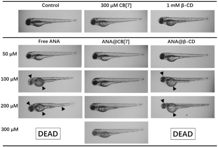 Morphology of representative zebrafish larvae (72 hpf) upon treatment with ANA w and w/o CB[7]/β-CD, respectively, for 48 h. Black arrowheads point to the abnormal morphologies.