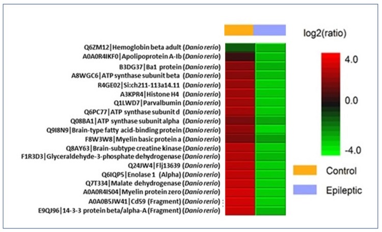 Differential expression (LFQ) of normal vs. epileptic zebrafish brain protein extract denoted by heat map. Label free quantification heat map for proteins identified from zebrafish brain (control vs. epileptic). Proteins with high ratio and low ratio are labelled red and green respectively. Samples are taken in triplicate where yellow line denotes epileptic group and light blue line denotes normal control group.
