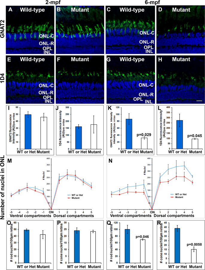 Loss of photoreceptors in pomgnt1 mutant retinas at 6-mpf but not 2-mpf. Retinal sections from 2-mpf and 6-mpf zebrafish were immunostained with GNAT2 antibody (green fluorescence, A–D) and 1D4 (green fluorescence, E–H). The sections were counter-stained with DAPI. To quantify photoreceptors, DAPI fluorescence confocal images of dorsal and ventral retinas from the optic nerve head to the ciliary margin were each divided into 5-equal compartments. Nuclei within the outer nuclear layer of each compartment were counted (M and N). GNAT2 and 1D4 immunoreactive intensities were measured (I–L). (A) Wild-type GNAT2 immunostaining at 2-mpf. (B) Homozygous pomgnt1sny7 mutant GNAT2 immunostaining at 2-mpf showing similar immunoreactivity compared to wild-type. (C) Wild-type GNAT2 immunostaining at 6-mpf. (D) Homozygous pomgnt1sny7 mutant GNAT2 immunostaining at 6-mpf showing reduced immunoreactivity compared to wild-type. (E) Wild-type 1D4 immunostaining at 2-mpf. (F) Homozygous pomgnt1sny7 mutant 1D4 immunostaining at 2-mpf showing similar immunoreactivity compared to the wild-type. (G) Wild-type 1D4 immunostaining at 6-mpf. (H) Homozygous pomgnt1sny7 mutant 1D4 immunostaining at 6-mpf showing reduced immunoreactivity compared to the wild-type. (I) GNAT2 immunofluorescence intensity quantification of wild-type and mutant fish at 2-mpf. There was no significant difference between wild-type and mutant retinas. (J) 1D4 immunofluorescence intensity quantification of wild-type and mutant fish at 2-mpf. There was no significant difference between wild-type and mutant retinas. (K and L) GNAT2 and 1D4 immunofluorescence intensity (artificial units, AU) in the mutant retina was reduced at 6-mpf. Student’s t-test. (M) Nuclei counting of outer nuclear layer at 2-mpf. There was no significant difference between wild-type and mutant retinas. (N) Nuclei counting of outer nuclear layer at 6-mpf. Nuclei within the outer nuclear layer in the mutant were reduced in number compared to wild-type. P = 0.00026; repeated measures ANOVA. (Oand P) 2-mpf nuclei count in the ONL-R and ONL-C retinal layers, respectively. There was no significant difference between wild-type and homozygous pomgnt1sny7 mutants. (Q and R) 6-mpf nuclei count in the ONL-R and ONL-C retinal layers, respectively. Note the significant reduction of nuclei in both ONL-R and ONL-C in homozygous pomgnt1sny7 mutants at 6-mpf. Together, these results indicated photoreceptor degeneration in mutant retina. Student’s t-test. Scale bar in H: 5 µm.