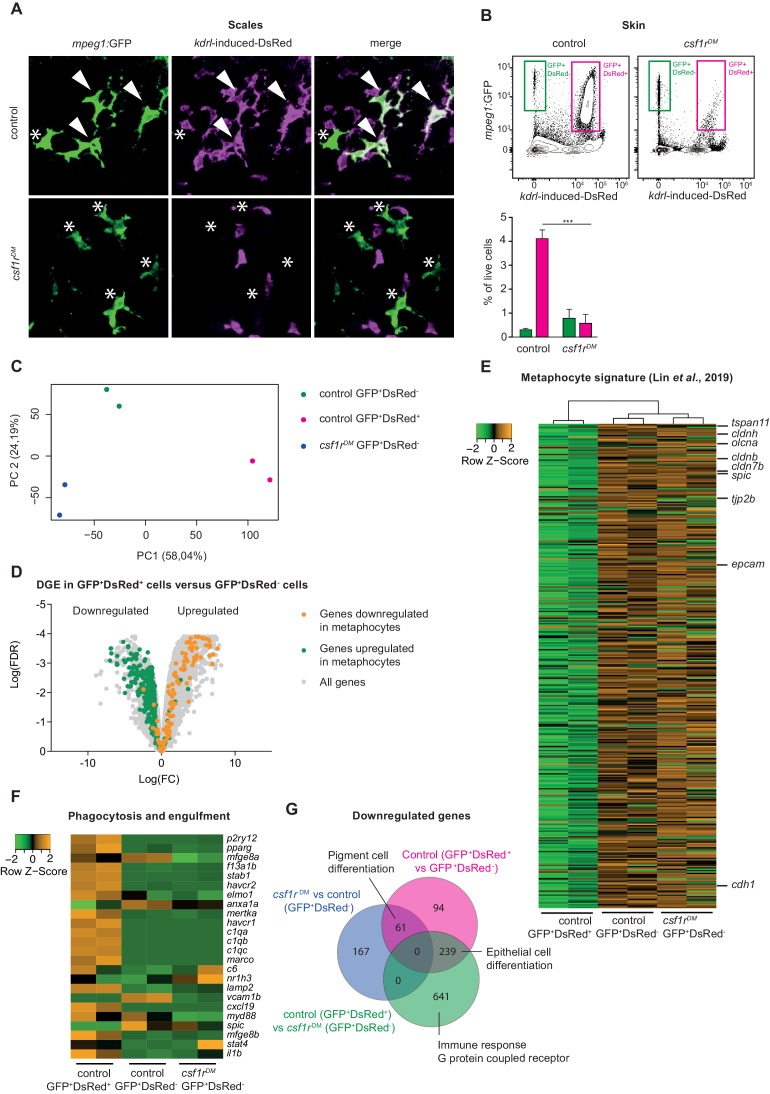 (A) Immunofluorescence on manually dissected scales from adult skin of control and csf1rDMmpeg1:EGFP +; kdrl-induced-DsRed+ adults (4 mpf). Stars: single-positive (SP) cells; white arrowheads: double-positive (DP) cells. (B) FACS analysis on cells from the adult skin (4 mpf, n = 3 per group) and quantification. GFP+DsRed-=mpeg1+ only, GFP+DsRed+=mpeg1+/kdrl-induced-DsRed+. (C) PCA analysis showing segregatin based on cell type (PC1) and genotype (PC2). (D) Volcano plot showing gene expression changes between control GFP+DsRed+ versus GFP+DsRed- cells. Light grey: DGE of all genes, Green: DGE of genes enriched in metaphocytes logFC >2 (Lin et al., 2019); Orange: DGE of genes downregulated in metaphocytes logFC <2 (Lin et al., 2019). (E) Heat map showing the expression of metaphocyte signature genes. (F) Heat map showing the expression of phagocytosis and engulfment genes. (G) Venn diagram showing DGE between the three groups (logFC > |2|; FDR < 0.05).