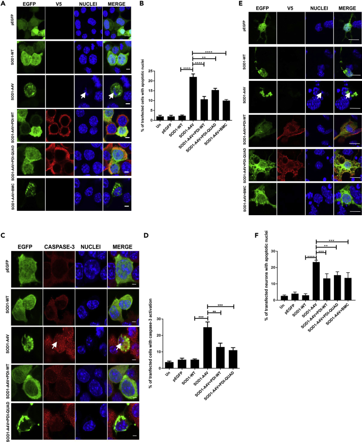 (C) Immunocytochemistry using activated caspase-3 antibodies (red), white arrow represents caspase-3 activation. Cells expressing EGFP (row 1), SOD1-WT (row 2), SOD1-A4V (row 3), or co-expressing SOD1-A4V and PDI-WT or PDI-QUAD (rows 4, 5).
