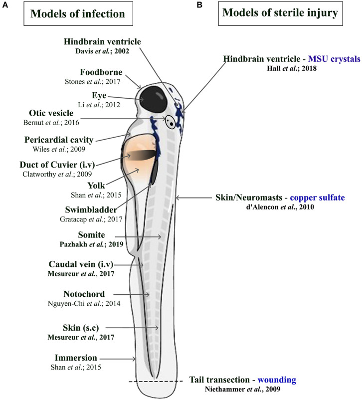Schematic illustration of the different delivery routes in larval zebrafish for pathogens. (