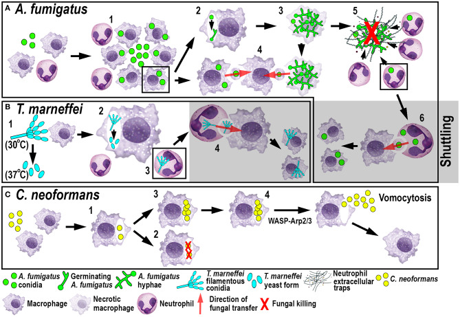 Schematic illustration of phagocyte responses to the fungal pathogens A. fumigatus(A), T. marneffei(B) and C. neoformans(C) in larval zebrafish. (A) Macrophages phagocytose A. fumigatus conidia and form tight clusters around the fungus, which inhibits fungal germination (1). Fungal germination can occur in the late phagosomes of infected macrophages (2) causing macrophage necroptosis (3). Transfer of A. fumigatus conidia can occur from infected and dying macrophages to recipient macrophages (4). Neutrophils kill A. fumigatus hyphae with their effector functions, including phagocytosis and NETosis (5). Infected neutrophils can transfer A. fumigatus to recipient macrophages through shuttling (6). (B)T. marneffei exists as filamentous conidia at 30°C and as pathogenic yeast form at 37°C (1). T. marneffei spores can transition to the yeast form within macrophages (2). Neutrophils can also phagocytose T. marneffei conidia (3) and transfer them to recipient macrophages through shuttling (4). (C) Macrophages phagocytose C. neoformans (1) where it can be killed (2) or persist and proliferate (3). WASP-Arp2/3 regulates vomocytosis and fungal dissemination (4).
