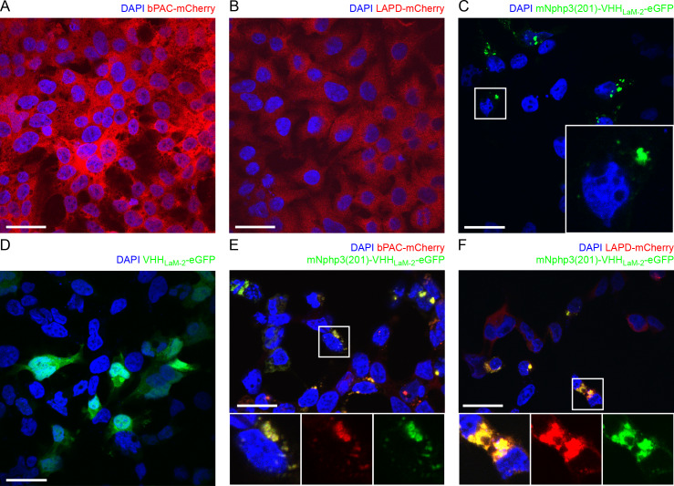 (A) HEK-TM cells expressing bPAC. HEK-TM cells stably expressing bPAC-mCherry (red) were fixed and labeled with DAPI (blue). Scale bar: 20 μm. (B) See A. for LAPD-mCherry. (C) HEK-TM cells expressing the cilia-targeted anti-mCherry mNphp3(201)-VHHLaM-2-eGFP (green) nanobody. The box indicates the position of the magnified view shown at the bottom right. (D) HEK-TM cells expressing the anti-mCherry VHHLaM-2-eGFP (green) nanobody. (E) Co-expression of the cilia-targeted anti-mCherry nanobody (LaM-2) (green) and bPAC-mCherry (red) in HEK-TM cells. The box indicates the position of the magnified view shown at the bottom: left: all channels as overlay; center: mCherry channel only; right: eGFP channel only. (F) Co-expression of the cilia-targeted anti-mCherry nanobody (LaM-2) (green) and LAPD-mCherry (red) in HEK-TM cells. The box indicates the position of the magnified view shown at the bottom: left: all channels as overlay; center: mCherry channel only; right: eGFP channel only.