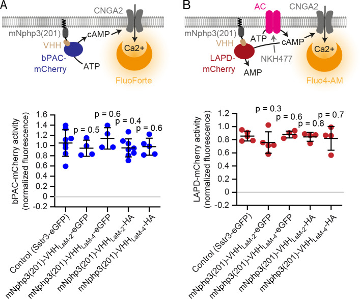 (A) bPAC activity measurements in HEK-TM cells. HEK293 cells express the CNGA2-TM ion channel, which opens upon cAMP binding and conducts Ca2+ (HEK-TM). bPAC-mCherry was co-expressed with the mNphp3(201)-tagged mCherry nanobody. Light-dependent activation of bPAC increases intracellular cAMP levels, leading to a Ca2+ influx, which was quantified using a fluorescent Ca2+ dye (GFP-certified FluoForte). bPAC activity was determined in the presence of mNphp3(201)-VHHLaM-2 or mNphp3(201)-VHHLaM-4 (fused to HA or eGFP). Co-expression with the ciliary protein Sstr3-eGFP was used as a negative control (ciliary localized protein, but not binding to bPAC or LAPD). bPAC activity was determined according to the maximum amplitude of the Ca2+ signal after light stimulation (465 nm light pulse, 1 s, 162 µW/cm²) compared to the ionomycin-evoked Ca2+ signal. 5 min before light stimulation, cells were treated with 25 µM of IBMX to inhibit phosphodiesterases and sustain a long-lasting increase in cAMP. NT: non-transfected cells. (B) LAPD activity measurements in HEK-TM cells. To measure LAPD activity, HEK-TM cells were pre-stimulated with 100 μM NKH477 to activate transmembrane adenylate cyclases (AC), thus increasing cAMP levels. Ca2+ influx was detected by a Ca2+ dye (Fluo4-AM). LAPD activity was determined in the presence of mNphp3(201)-VHHLaM-2 or mNphp3(201)-VHHLaM-4 (fused to HA or eGFP). Co-expression of the ciliary protein Sstr3-eGFP was used as a negative control (ciliary localized protein, but not binding to bPAC or LAPD). Fluo4-AM-loaded HEK-TM cells were incubated with 100 μM NKH477 during continuous 850 nm light illumination (0.5 µW/cm²). When reaching a steady-state, light was switched to 690 nm (0.5 µW/cm²) to stimulate LAPD activity. LAPD activity was determined as the maximal decrease compared to the maximal Ca2+ signal amplitude after NKH477 addition. Data are shown as individual data points (each data point represents and independent experiment and corresponds to the average of a duplicate or triplicate measurement) and mean ± S.D., p-values calculated using unpaired, two-sided Student's t-test compared to Sstr3-eGFP are indicated. All HEK-293 cells were non-ciliated.