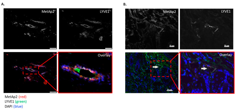 Cancer tissue samples retrieved from two breast cancer patients express MetAp2 and LYVE1. (