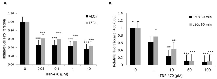 Inhibition of VEC and LEC proliferation and adhesion induced by the inhibition of MetAp2. (A) MetAp2 inhibition impairs the ability of both cell lines to proliferate. Cells were treated with different concentrations of TNP-470 for 72 h, after which an MTT assay was conducted to quantify their proliferation. A dose-dependent reduction was observed. *** p < 0.005, compared with the control of the same cells. n = 5. (B) HMVEC-dLyAd cells were stained with DiO and treated with TNP-470; they showed a significant decrease in their ability to adhere. The relative fluorescent cell population was quantified using the Synergy HT multi-mode microplate reader. n = 4. ** p <0.01, *** p < 0.001. The results are presented as mean ± SEM.