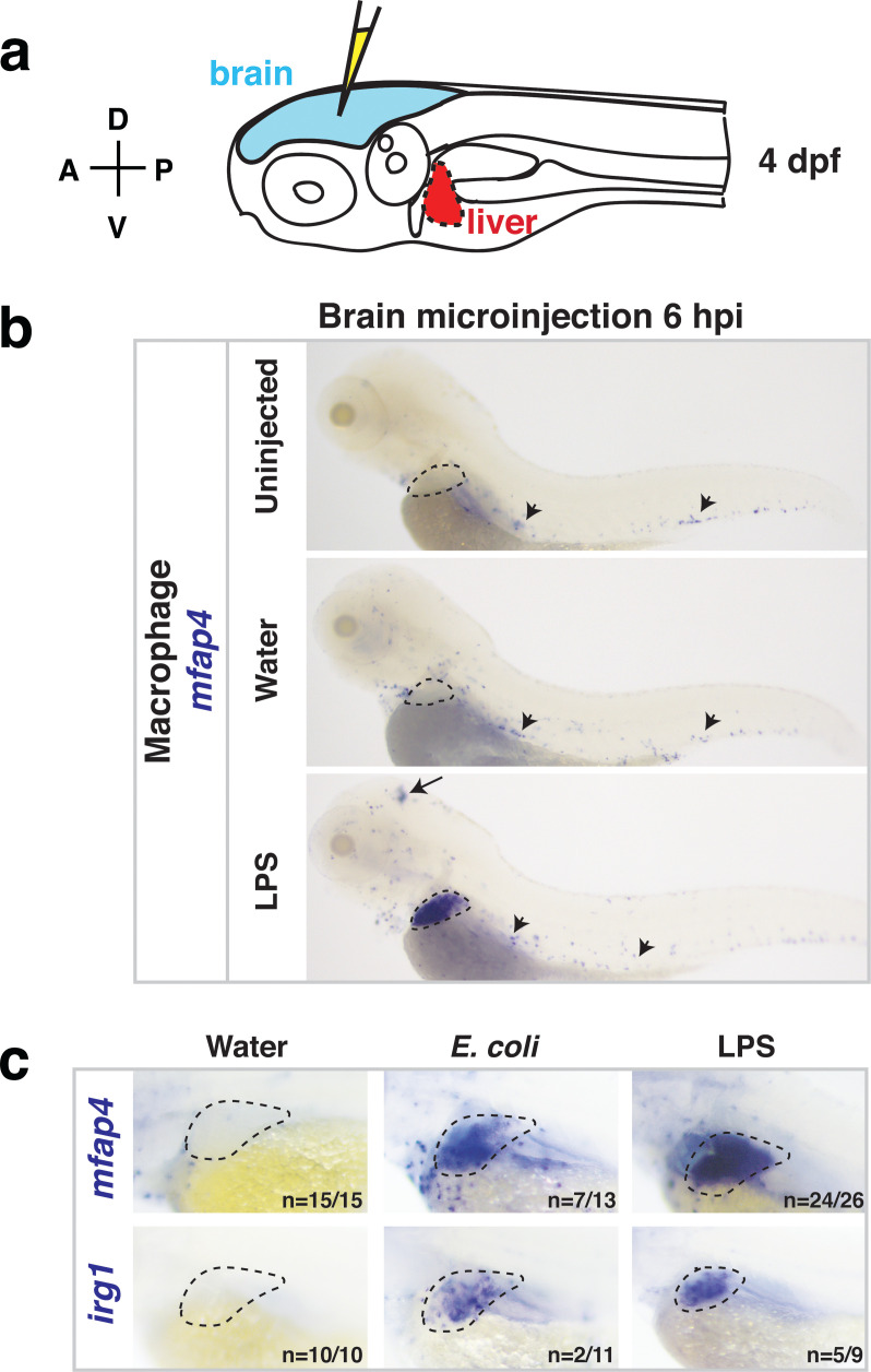 (a) Schematic showing injection of substances (yellow) in the tectum parenchyma (blue) in the four dpf zebrafish larva and subsequent analysis of the periphery that highlights the most prominent change in the liver (red). A, anterior; P, posterior; D, dorsal; V, ventral. (b) In the four dpf zebrafish, macrophages (mfap4+) are normally absent in the liver (dotted region) while sparsely spread throughout the body (arrowheads) as shown in larvae which were uninjected or water vehicle injected in the brain at six hpi. By contrast, after LPS injection in the brain, strong expression of macrophage marker mfap4 is found in the liver (dotted region), while the brain injection site is often also accompanied by a mfap4 expression increase (arrow). (c) Analysis of zebrafish macrophage-specific markers mfap4 and irg1 in the liver (dotted region) after brain injections with water vehicle, E. coli, or LPS. Results indicate that both LPS and E. coli injections induce ectopic localization of macrophages in the liver, which appear to be activated (expressing irg1) at least in a subset, but no macrophages in the liver in control animals.