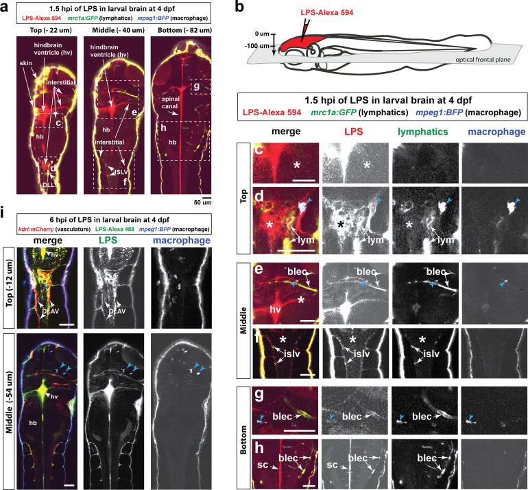 Wild-type double transgenic zebrafish at four dpf were microinjected with fluorescently tagged LPS in the tectal brain. To localize the LPS relative to the lymphatic and vasculature structures, two transgenes were used: