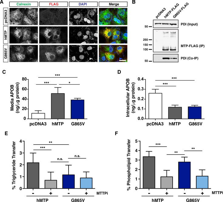 (A) Immunofluorescence in COS-7 cells expressing wild-type human MTTP-FLAG or human MTTP(G865V)-FLAG proteins using anti-FLAG (red) and anti-Calnexin (green) antibodies; scale = 25 μm. (B) Human MTP-FLAG proteins (WT and G865V) were immunoprecipitated from COS-7 cell lysate (400 μg protein) using the M2 flag antibody and immunoblots were probed for both FLAG and PDI. For input, 15 μg protein was used. (C, D) COS-7 cells were co-transfected with human APOB48 and either wild-type human