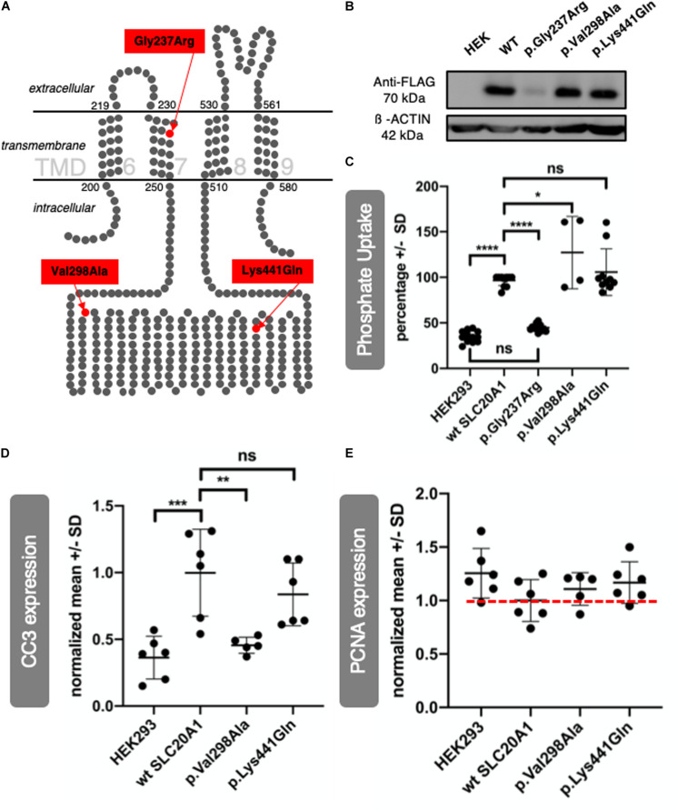 SLC20A1 as transmembrane phosphate transporter and in vitro characterization of its variants found in BEEC individuals. (A)In silico 2D model of SLC20A1, a multi-pass integral membrane protein, indicating localization of variants found in affected individuals, c.709G > A (p.Gly237Arg) in TMD 7, c.893T > C (p.Val298Ala) and c.1321A > C (p.Lys441Gln) are located in an intracellular loop. Only four (6–9) of a total of twelve TMDs are shown in this simplified model. The model was generated based on the data of Beck et al. (2009). (B,C)SLC20A1 mediated 32PO4 transport in transiently transfected HEK293 cells. (B) WB analysis of 100 μg whole cell homogenates obtained from HEK293 cells transfected with 500 ng plasmid DNA per cm2 well surface. Plasmid DNA was FLAG tagged and transfection efficiency was detected using anti-FLAG antibody (70 kDa) and anti-ß-ACTIN antibody (42 kDa), which served as loading control. As expected, no FLAG signal could be detected in negative control (untransfected HEK293 cells, marked as HEK). Transfection worked for wt SLC20A1 overexpression as well as the variants c.893T > C (p.Val298Ala) and c.1321A > C (p.Lys441Gln). No FLAG signal could be detected for c.709G > A (p.Gly237Arg) transfected cells. Even when transfected with higher plasmid concentrations, p.Gly237Arg was not detectable in HEK293 cells (Supplementary Data Sheet S12). (C) Endpoint assay of transient transfected HEK293 cells. Cells were incubated with 1 μCi 32PO43– and 200 μM K3PO4 for 15 min. For better comparison, a highest number of counts per minute in wt SLC20A1 overexpression group was set as 100% in each experiment (N = 6 with two datasets each), values of HEK293 and variants were calculated correspondingly, and resulting values in percentage are shown on the y-axis (Error bars show SD). A two-way ANOVA of the grouped analysis was significant ((p < 0.0001). p.Gly237Arg did not show any differences of phosphate uptake to negative HEK293 control. This is in line with the expression deficiency of p.Gly237Arg described before. Wt SLC20A1 overexpression showed a significant increase of phosphate uptake compared to untransfected HEK293 (Tukey’s multiple comparison: ****p < 0.0001). Amin acid change p.Lys441Gln and p.Val298Ala overexpression resulted in an even higher phosphate uptake than wt SLC20A1 overexpression with a significant difference between p.Val298Ala and wt SLC20A1 (Tukey’s multiple comparison: *p < 0.05). Therefore, variant overexpression does not impair phosphate uptake capability in vitro. (D,E) Densitometric analysis of WBs (N = 6) from whole cell homogenates was obtained from transfected HEK293 cells. WBs are provided in Supplementary Data Sheet S13. Y-axis shows normalized values against wt SLC20A1 overexpression. Error bars show SD. (D) Expression of CC3 as apoptosis marker was measured in six WBs of corresponding independent transfection experiments. The one-way ANOVA was significant (p = 0.0002), Tukey’s multiple comparison test was significant for HEK293 vs. WT (***p = 0.0005), and WT vs. p.Val298Ala (**p = 0.0038). Wt SLC20A1 overexpression in HEK293 cells increased apoptosis when compared to untransfected negative control (HEK). There is no induction of apoptosis inc.893T > C (p.Val298Ala) transfected cells, comparable to untransfected negative control (HEK). c.1321A > C (p.Lys441Gln) does not result in significant reduction of CC3 expression. However, a trend of reduced CC3 expression in comparison to wt SLC20A1 overexpression can be seen. (E) Same analysis was used to study expression of PCNA as a proliferation marker. A one-way ANOVA did not show significant results (p = 0.1903). Nevertheless, wt SLC20A1 overexpression seems to reduce PCNA expression when compared to negative control (untransfected HEK). Variants analyzed [c.893T > C (p.Val298Ala) and c.1321A > C (p.Lys441Gln)] tend to reduce PCNA less than WT overexpression (red dotted line for better comparison).)
