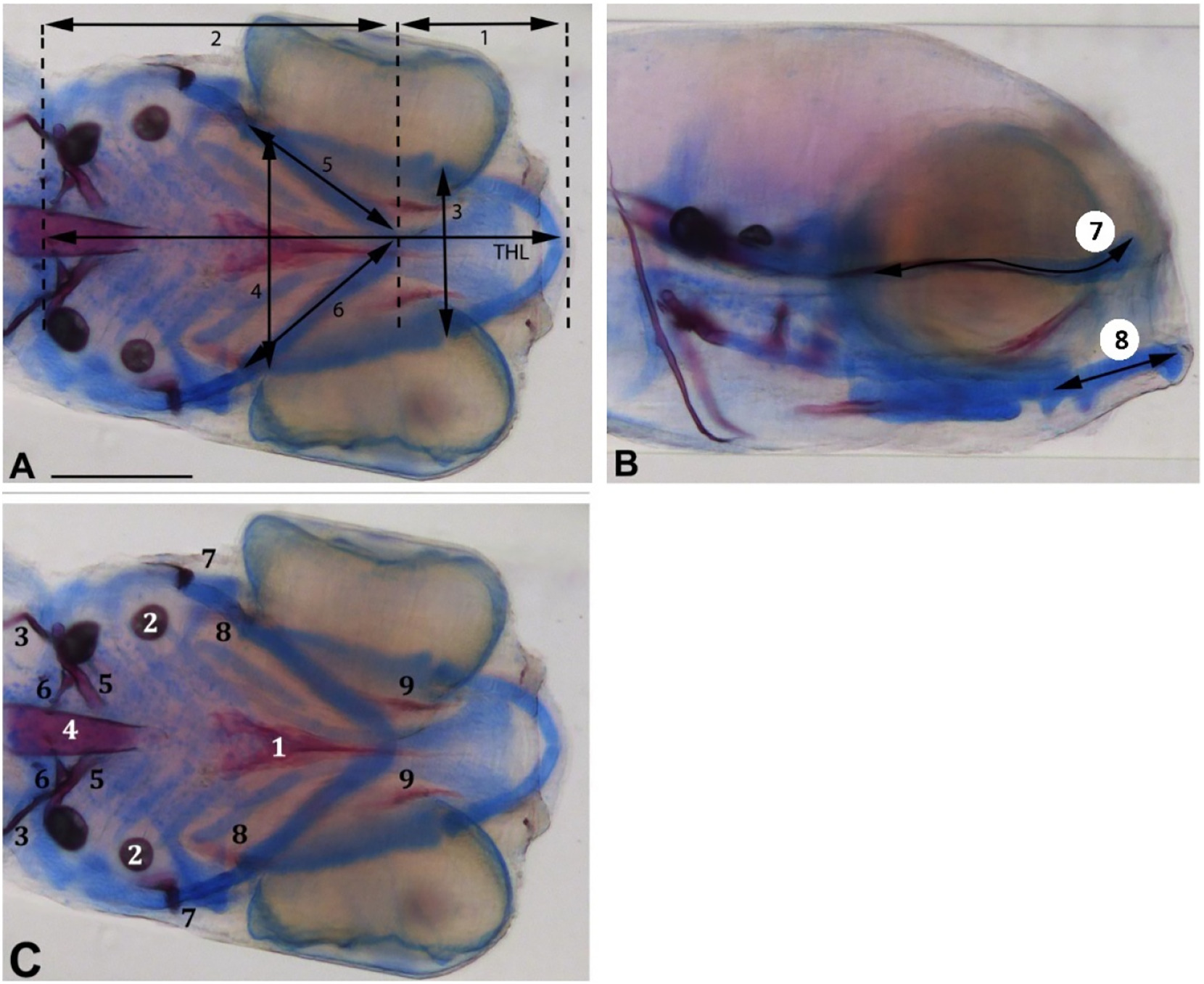 Fig. 1 Fig. 1. 5 dpf zebrafish larva (wildtype) stained for cartilage (blue) and bone (red). A total of nine parameters for cartilage were assessed as shown in panels A (ventral view) and B (lateral view): 1 Length ceratohyal to Meckel's cartilage, 2 Length ceratohyal to posterior end of the head, 3 Width at Meckel's cartilage and palatoquadrate joint, 4 Width at ceratohyal and palatoquadrate joint, 5 Length of ceratohyal superior, 6 Length of ceratohyal inferior, 7 Length of ethmoid plate, 8 Lateral length of Meckel's cartilage. The long central arrow indicates total head length (THL). Scale bar is 200 μm. C: The nine mineralized parameters scored for presence or absence (ventral view): 1) Parasphenoid, 2) Otoliths (4 in total), 3) Cleithrum, 4) Notochordal sheath, 5) Ceratobranchial 5, 6) teeth (on ceratobranchial 5), 7) opercles, 8) Branchiostegal ray 1, 9) Entopterygoid bone. (For interpretation of the references to colour in this figure legend, the reader is referred to the web version of this article.)