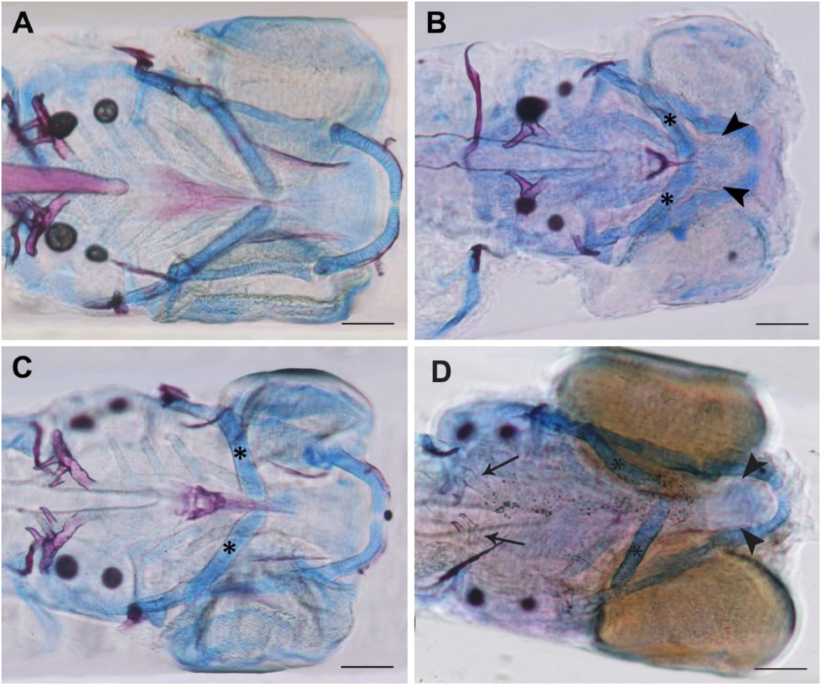 Fig. 2 Fig. 2. A–D: Control and examples of VPA treated larvae at 5 dpf. Larvae are stained with Alcian blue (cartilage) and Alizarin red (mineralization). A: Control larvae. B: Larva treated with 100 μM VPA during 1–13 hpf, showing reduced size of cartilage elements and lacking mineralization of the notochord sheath, branchiostegal ray 1 and the entopterygoid bone (see arrowheads). C: Larva treated with 50 μM VPA during 25–37 hpf, showing small reductions in the length of the ceratohyals (asterisks). D: Larva treated with 100 μM VPA during 25–37 hpf with reduced size of cartilage elements and lacking mineralization of the notochord sheath, ceratobranchial 5 (arrows) and the entopterygoid bone (arrowheads). Scale bars are 100 μm.
