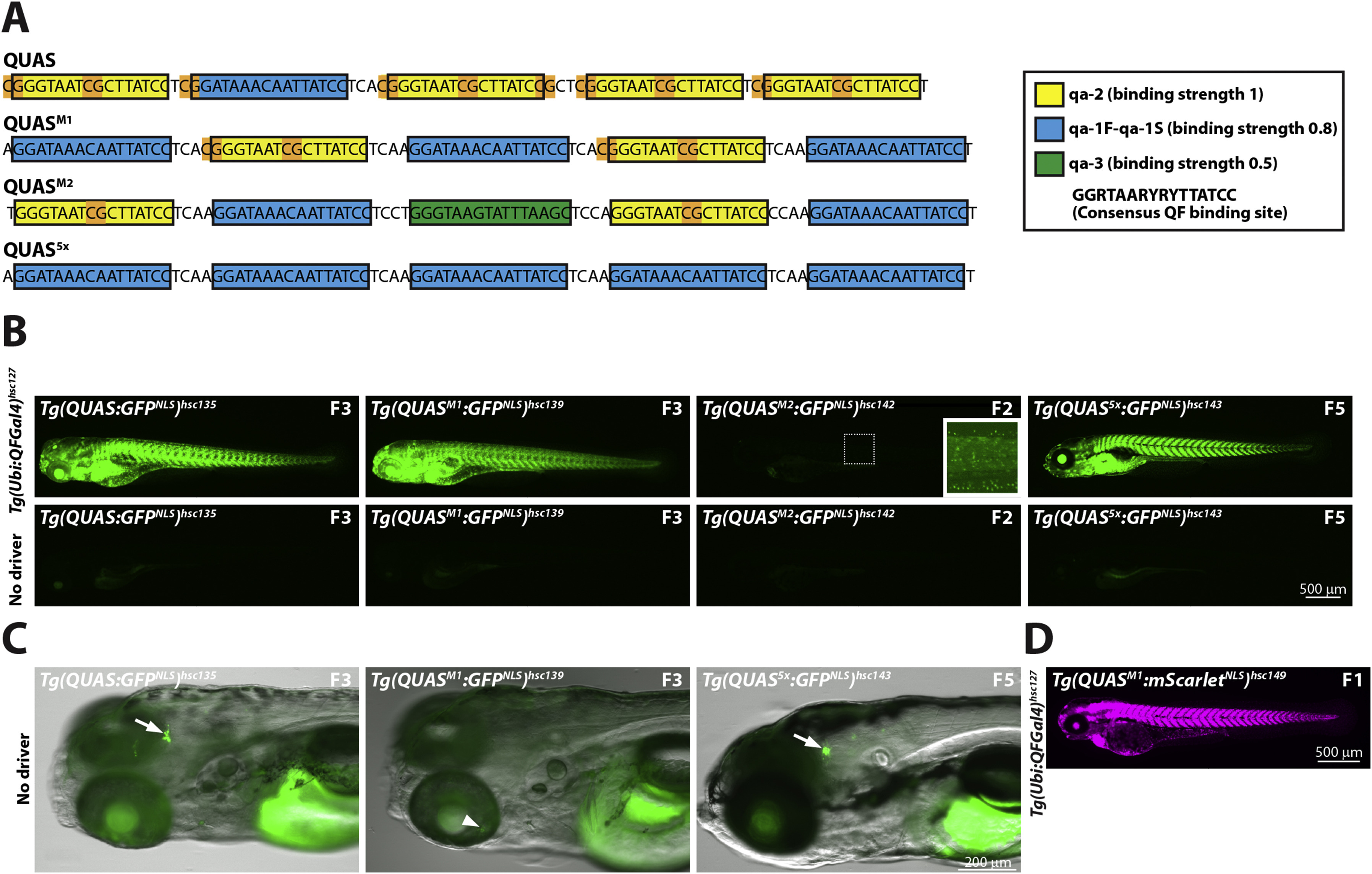 Fig. 3 Optimization of QUAS binding sites. (A) Schematic depicting QUAS binding sites for various QUAS elements. The original QUAS element contains 4 copies of qa-2 (yellow box) and one copy of qa-1F-qa-1S (blue box) (Potter et al., 2010). CpG dinucleotides are highlighted in orange. Note that CpG dinuclotides are present in linker regions and the non-consensus nucleotides of the qa-2 binding site. To reduce CpG content, and increase variability, we generated QUAS mixed-1 (QUASM1), QUAS mixed-2 (QUASM2) and QUAS5x. These new QUAS elements contain fewer copies of the qa-2 binding site to reduce CpG content. In addition, QUASM2 contains the qa-3 binding site (green box), not present in the original QUAS element. QUASM1, QUASM2, and QUAS5x contain, four, two and no CpG dinucleotides, respectively. Neurospora crassa QF-binding sites, as well as relative affinity of the QF DBD to each binding site, was described previously (Baum et al., 1987). Yellow box: qa-2 (relative QF DBD binding strength of 1); Blue box: qa-1F-qa-1S (relative binding strength of 0.8); Green box: qa-3 (relative binding strength of 0.5). The consensus QF binding site is shown in the boxed inset. (B) Epifluorescence micrographs showing representative GFPNLS expression from either Tg(QUAS:GFPNLS)hsc135, Tg(QUASM1:GFPNLS)hsc139, Tg(QUASM2:GFPNLS)hsc142 or Tg(QUAS5x:GFPNLS)hsc143 reporter lines crossed to a fourth generation Tg(ubi:QFGal4)hsc127 driver line. QUAS5, QUASM1 and QUAS5x elements exhibited comparable in vivo activity, as assessed by GFPNLS reporter expression. In contrast, the QUASM2 element showed weak in vivo activity. All larvae shown are 5 dpf larvae, and the generation of the reporter line is indicated. (C) Epifluorescence micrographs showing leaky GFPNLS expression from QUAS and QUAS5x reporter lines in the absence of a QF driver line. Leaky GFPNLS expression was observed in the brain for Tg(QUAS:GFPNLS)hsc135 and Tg(QUAS5x:GFPNLS)hsc143, but not for Tg(QUASM1:GFPNLS)hsc139 (arrow). Conversely, faint variegated GFPNLS expression was observable in the retina of Tg(QUASM1:GFPNLS)hsc139 (arrowhead). Leaky expression for QUAS, QUAS5x and QUASM1 was evident in multiple, independently derived transgenic lines (see Supplemental Fig. 2B). All larvae were treated with PTU to block pigmentation and were imaged at 5 dpf. (D) Epifluorescence micrograph showing ubiquitous mScarletNLS expression from a Tg(QUASM1:mScarletNLS)hsc149 reporter line crossed to a Tg(ubi:QFGal4)hsc127 driver line. An F1 larvae imaged at 3 dpf is shown.