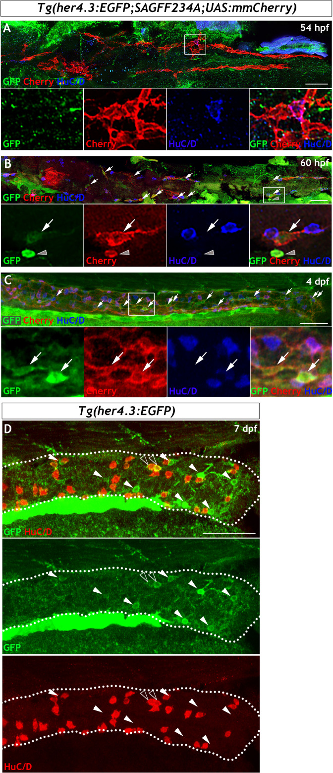 (A–C) Analysis using Tg(her4.3:EGFP;SAGFF234A;UAS:mmCherry) allows her4.3:EGFP+ cells to be examined relative to the Cherry+ migrating NC cell population that colonises the gut during development. (A) At 54 hpf, no GFP+ cells (green) are present in the gut and none are detected within the population of migrating NC cells (red), although NC cell-derived HuC/D+ ENS neurons are present at this time (blue). Single channels shown in high magnification view of boxed region (n = 30). (B) At 60 hpf, small numbers of weakly GFP expressing cells (green, arrows) can be seen within the streams of NC cells colonising the gut (red). GFP+ cells are seen in proximity to HuC/D+ cells (blue). Note strongly GFP expressing cells can be detected, but these cells do not form part of the NC cell migratory streams (red) and are outside of the gut (grey arrowhead), and are likely to be melanocytes (n = 30). Single channels shown in high magnification view of boxed region. (C) At 4 dpf, an increased number of both strongly and weakly GFP expressing cells (green, arrows) are found within the stream of migratory NC cells (red). Single channels shown in high magnification view of boxed region (n = 20). (D) At 7 dpf Tg(her4.3:EGFP) larvae GFP expressing cells (green, arrowheads) are closely associated with, but distinct from, HuC/D+ positive neurons (red) (n = 45). Occasionally HuC/D is seen to overlap with cells expressing low levels of GFP (open arrowheads). All confocal images are max projections of short confocal stacks. Scale bars in merge panels: 50 µm.