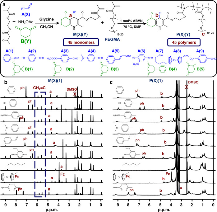 a HTP preparation of 45 monomers via Hantzsch’s reaction and 45 polymers via free radical polymerization. b1H NMR spectra (DMSO-d6, 400 M) of M(X)(1) monomers. c1H NMR spectra (DMSO-d6, 400 M) of P(X)(1) polymers.