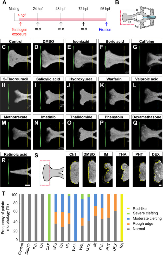 Morphological phenotype of chemical-induced cleft palate in zebrafish embryos. (A) Experimental time course m.c.: medium change. (B) Atlas of the neurocranial cartilage. Ep, Ethmoid plate; Tr, Trabecula; Pch, Parachordal. (C–R) Fluorescence images of the ethmoid palate (zebrafish palate) at 96 hpf. Nuclei of cartilage cells were stained with DAPI. The anterior and posterior edges of the palate are indicated by green and yellow dotted lines, respectively. Exposure concentration was as follows: DMSO as vehicle control (0.1%), isoniazid (INA, 1 mM), boric acid (BA, 1 mM), caffeine (CAF, 1 mM), 5-fluorouracil (5FU, 1 mM), salicylic acid, (SA, 200 μM), hydroxyurea (HU, 1 mM), warfarin (WAF, 30 μM), valproic acid (VPA, 15 μM), methotrexate (MTX, 200 μM), imatinib (IM, 250 μM), thalidomide (THA, 400 μM), phenytoin (PHT, 1 mM), dexamethasone (DEX, 1 mM), and retinoic acid (RA, 10 nM). (S) Highly magnified images of the anterior edge of the palate. Ctrl, control; IM, imatinib; THA, thalidomide; PHT, phenytoin; DEX, dexamethasone. Yellow dotted line traces the shape of anterior edge. (T) Frequency of palate morphology. n = 19 (Control), 18 (DMSO), 11 (INA), 14 (BA), 17 (CAF), 8 (5FU), 16 (SA), 27 (HU), 11 (WAF), 18 (VPA), 14 (MTX), 24 (IM), 17 (THA), 10 (PHT), 22 (DEX), 16 (RA). Scale bars: 50 μm in (C–R), 20 μm in (S).