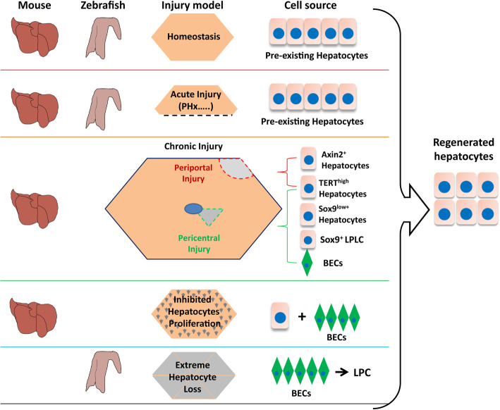 A cartoon for comparing origin of hepatocytes during liver homeostasis and regeneration in mouse and zebrafish. Liver initiates different regeneration modes in response to different degrees of damages. Proliferation of embryonic hepatocytes make main contribution to hepatocytes in a normal adult liver. Proliferation of mature hepatocytes are responsible for maintaining hepatocyte homeostasis in a normal adult liver and recovery of liver mass after acute injuries such as PH (top two panels). Chronic injuries near the periportal region (periportal injury) will probably activate the Axin2+ cells around central vein to produce new hepatocytes (highlighted in red, third panel). In contrast, chronic injuries around the central vein region (pericentral injury) seems to mobilize Sox9low+ or/and Sox9+ LPLC hepatocytes around periportal region to generate new hepatocytes (highlighted in green, third panel). As the degree of damage increases, such as treating mouse with TAA for 24 weeks, biliary epithelial cells (BECs) start to make contribution to the production of hepatocytes through direct lineage conversion (third panel). It is proposed that TERThigh hepatocytes might be a universal cell source for liver regeneration under periportal, pericentral or other injury conditions (third panel). Impaired proliferation ability of hepatocytes, such as in the case of
