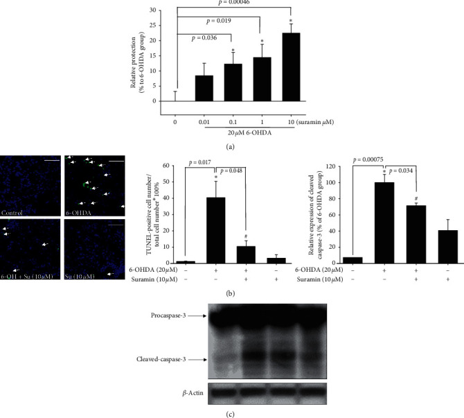 The neuroprotective effect of suramin on 6-OHDA-induced damage in SH-SY5Y cells. (a) SH-SY5Y cells were pretreated with 0.01, 0.1, 1, and 10