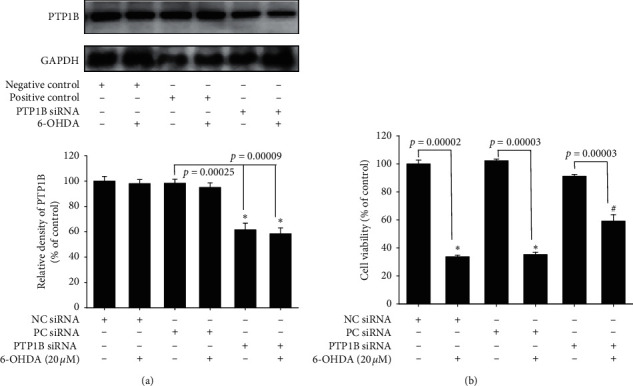 Effect of PTP1B knockdown in SH-SY5Y on PTP1B expression and neuroprotective effect against 6-OHDA damage. (a) SH-SY5Y cells were transfected with siRNAs by LipofectAMINE PlusReagent for 3 h and incubated with new medium overnight. Western blotting for PTP1B of the control (negative control), 6-OHDA (negative control), control (positive control), 6-OHDA (positive control), control (PTP1B siRNA), and 6-OHDA (PTP1B siRNA) groups is shown. Data are presented as mean ± SEM, and each value contains three replicates and three samples.