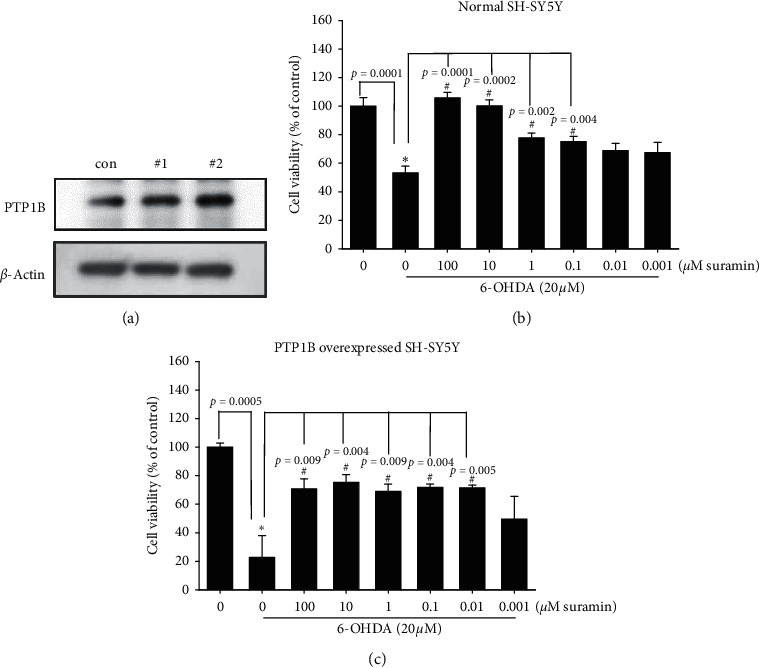 Effect of PTP1B overexpression in SH-SY5Y on PTP1B expression and neuroprotective effect against 6-OHDA damage. (a) PTP1B-overexpressed SH-SY5Y was established by the transfection of PTP1B plasmid. Western blotting for PTP1B of the control, #1 PTP1B-overexpressed SH-SY5Y, and #2 PTP1B-overexpressed SH-SY5Y groups are shown. (b) Normal SH-SY5Y cells were pretreated with 0.01, 0.1, 1, and 10