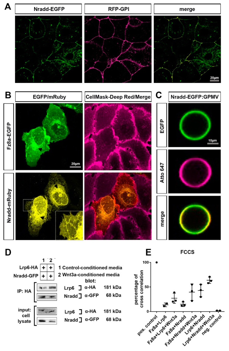 Figure 4 Nradd localizes to the plasma membrane and interacts with the Wnt–receptor complex (A) Nradd-EGFP (green) and RFP-GPI (red) localize at the plasma membrane of the enveloping layer cells of zebrafish embryos at 4 hpf (dome stage). (B) In U2OS cells, Fz8a-EGFP (green) co-localizes with the CellMask Deep Red (red) at the plasma membrane while Nradd-mRuby (yellow) localizes to the ER, but a significant fraction of it is in the plasma membrane, as seen from the zoom-in inset image. Arrows indicate protein transport from the ER to the plasma membrane. (C) Nradd-EGFP (green) localizes to the surface of cell-derived giant plasma membrane vesicles (GPMVs) and overlaps with the plasma membrane marker Atto647N-PE (red). (D) Nradd-GFP co-immunoprecipitates with Lrp6-HA in HEK293T cells. Three independent experiments were performed. (E) Fluorescence cross-correlation spectroscopy (FCCS) measurements show cross-correlation percentages between Fz8a-Lrp6, Fz8a-Nradd and Lrp6-Nradd, with/without Wnt3a stimulation at the plasma membrane. Nradd co-diffuses with Fz8a and Lrp6 at the membrane and this co-diffusion is enhanced by Wnt3 stimulation. EGFP and mCherry proteins were used as negative controls and their cross-correlation percentage is 1.70%.