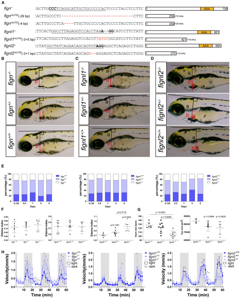Loss of fignl2 leads to smaller eyes, pericardial edema, and reduced swimming velocity. (A) Mutated alleles generated using CRISPR/Cas9 lead to complete loss of the AAA-type ATPase domain. Underlined sequences are the CRISPR targets, wherein the bases in bold are the proto-spacer adjacent motifs (sequences are shown only on the sense strand). (B–D) Representative phenotype observation and edema index measurement in Fign mutants (B), Fignl1 mutants (C), and Fignl2 mutants (D) at 4 dpf. (E) Percentage of the filial embryos generated by crossing of fign+/ntu702 × fignl2+/ntu702, fignl1+/ntu704 × fignl2+/ntu704 and fignl2+/ntu705 × fignl2+/ntu705, showing partial embryonic lethality of fignl2 loss-of-function. Significance of differences compared to the wild type group is shown as p values on top of each dataset, and those between different mutant genotypes are shown on a horizontal line indicating groups used for comparison. (F) Statistics of pericardial edema index (PEI), n = (6,6,6) and (6,6,6) and (5,8,6); *p < 0.05, showing that the severity of edema was negatively correlated with functional fignl2 alleles. (G) Heart rate of the filial embryos generated by crossing of fignl2+/ntu705 × fignl2+/ntu705 showing abnormalities in the cardiovascular system in the fignl2 mutants, n = 6,10,8. Eyes of the filial embryos generated by crossing of fignl2+/ntu705 × fignl2+/ntu705 showing abnormalities in the cardiovascular system in the fignl2 mutants, n = 5,8,6. (H) Statistics of swimming velocity with 10-min light-dark cycle of fign, fignl1, and fignl2 mutants at 5 dpf, n = (12,25,9) and (14,22,11), and (20,19,9), showing weakened swimming ability of fignl2 mutants. Circles indicate a p < 0.1, asterisks (*) indicate a p < 0.05, and (**) indicates a p < 0.01, as indicated by the Student's t-test between the wild type and homozygous mutant groups.